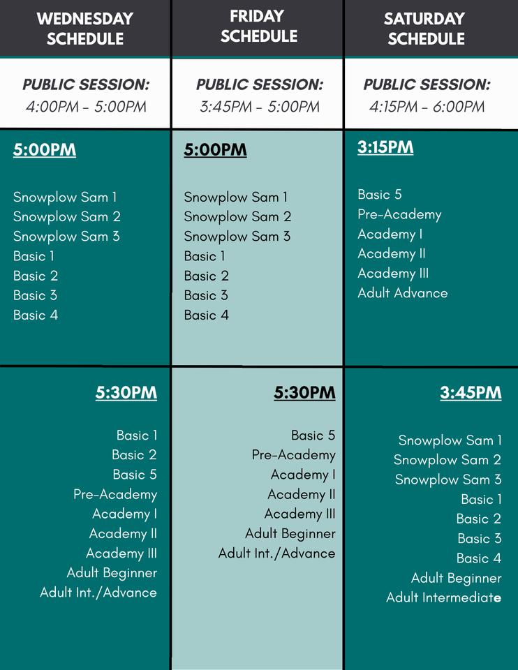 A free public session is included on the day of your class. Skating school students are required to check in at the Box Office to receive a wristband prior to getting on the ice. The public session is held before class on Wednesdays and Fridays, and after class on Saturdays. Skaters can utilize these sessions to practice their skills from class, take private lessons, or skate with friends and family. Anyone not enrolled in skating school is welcome to skate on public sessions for $20 admission plus $5 skate rental fee.